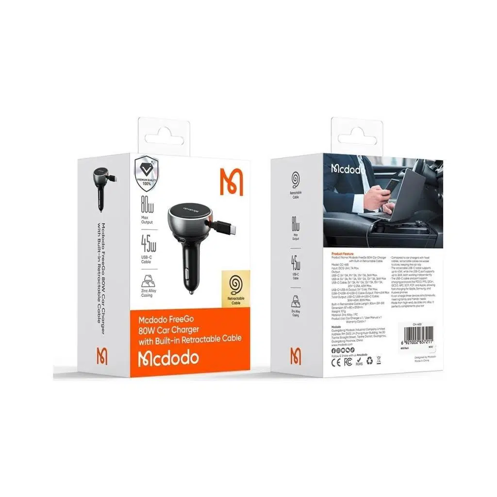 Mcdodo FreeGo 80W Dahili Geri Çekilebilir Kablolu Araç Şarj Cihazı, modern teknolojiyle tasarlanmış, şık ve kullanışlı bir çözüm sunar. Geri çekilebilir USB-C kablosu sayesinde aksamaya son verirken, toplamda 80W’a kadar ulaşan çıkış gücü ile üç cihazı aynı anda hızlı ve güvenli bir şekilde şarj etme imkanı tanır.
