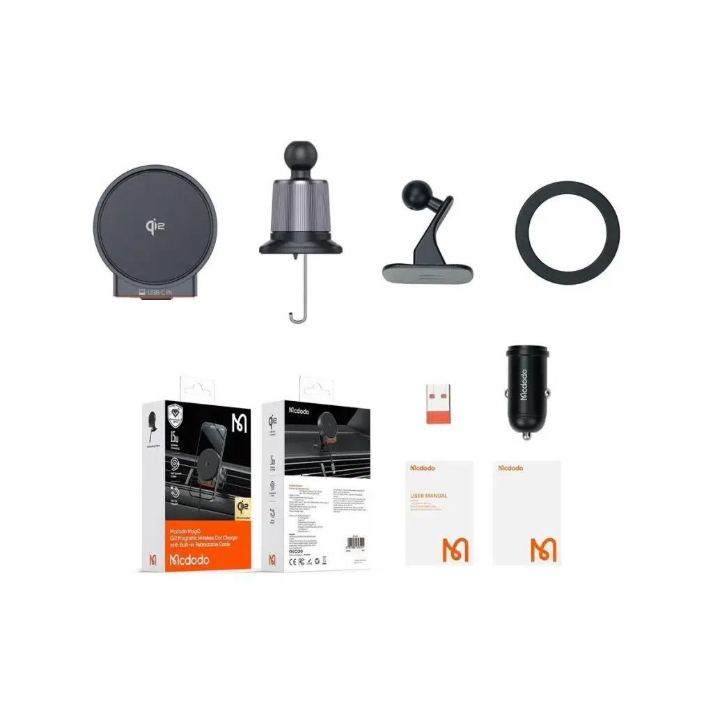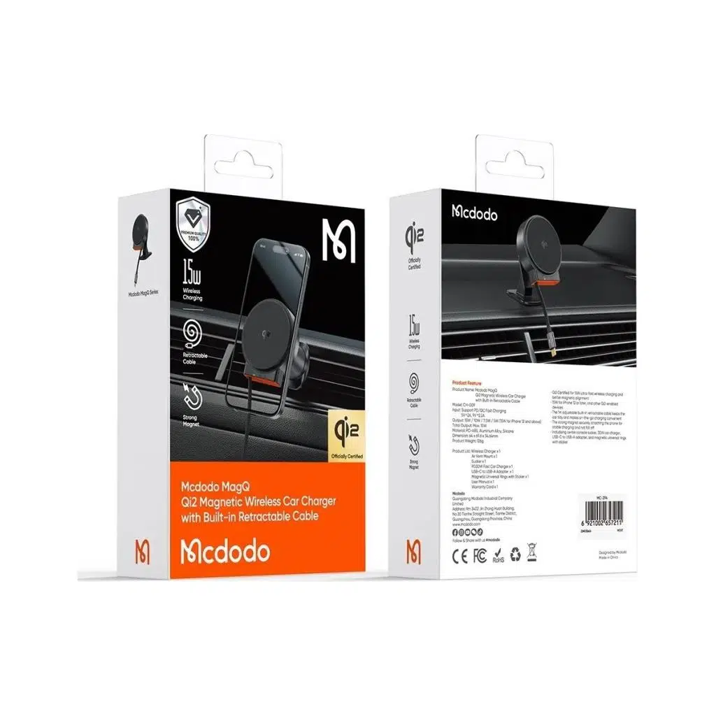 Mcdodo MagQ Serisi’nin en gelişmiş modellerinden biri olan CH-0090, Qi2 sertifikalı 15W manyetik kablosuz şarj ile iPhone 12 ve üzeri modelleri hızlı, güvenli ve kablosuz bir şekilde şarj etmenizi sağlar. Dahili geri çekilebilir kablosu ve çok yönlü aksesuar setiyle tam donanımlı, şık ve fonksiyonel bir araç içi şarj çözümüdür.