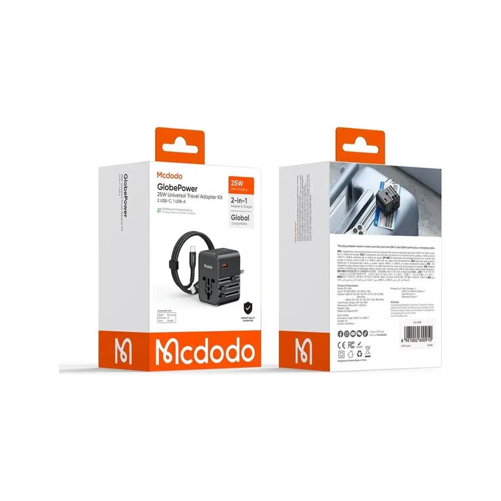 Mcdodo CP-3260 GlobePower 25W Evrensel Seyahat Adaptörü Dünyayı keşfetmeyi sevenlerin vazgeçilmezi olan Mcdodo GlobePower 25W Evrensel Seyahat Adaptörü, 200'den fazla ülkede priz uyumluluğuyla her yere yanınızda getirebileceğiniz bir çözüm sunuyor! 2 USB-C + 1 USB-A Bağlantısı ile Hızlı Şarj İmkanı Hızlı şarj25W güç çıkışı ile cihazlarınızı kısa sürede doldurun! Kompakt Tasarım Katlanabilir fiş uçları ile çantanızda az yer kaplayan bu taşınabilir adaptör, dayanıklı yapısı sayesinde uzun ömürlü kullanıma da uygun. %100 Plastiksiz Ambalaj Çevre dostu ambalaj seçeneği ile doğaya saygılı bir tercih yaparak, seyahatlerinizi daha sürdürülebilir hale getirin. Kutu İçeriği GlobePower 25W Evrensel Adaptör x1USB-C – USB-C Hızlı Şarj Kablosu x1Kullanım Kılavuzu x1Garanti Kartı x1Haydi, dünya sizin olsun! Mcdodo GlobePower ile her yerde bağlantıda kalın!