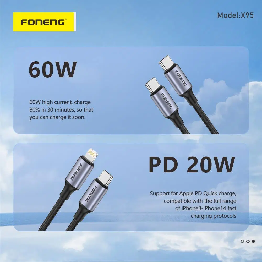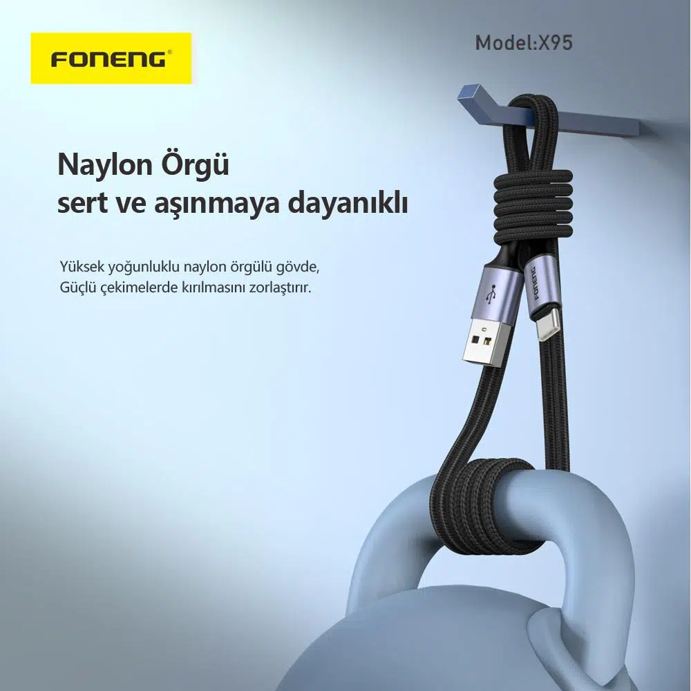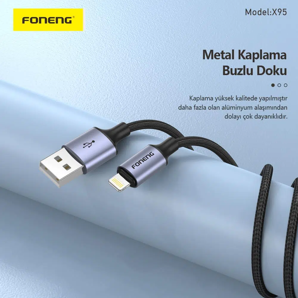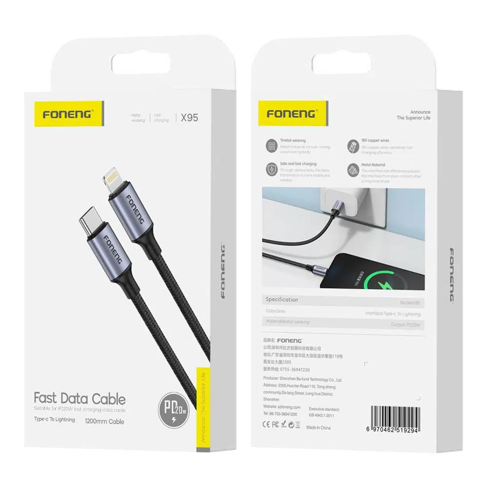 Foneng X95 PD 20W Type-c TO Lightning Şarj Ve Data Kablosu Alüminyum alaşımlı kabuk + siyah kazınmış LOGO, 162 saf bakır bakır teller, hassas örgülü tel gövde
