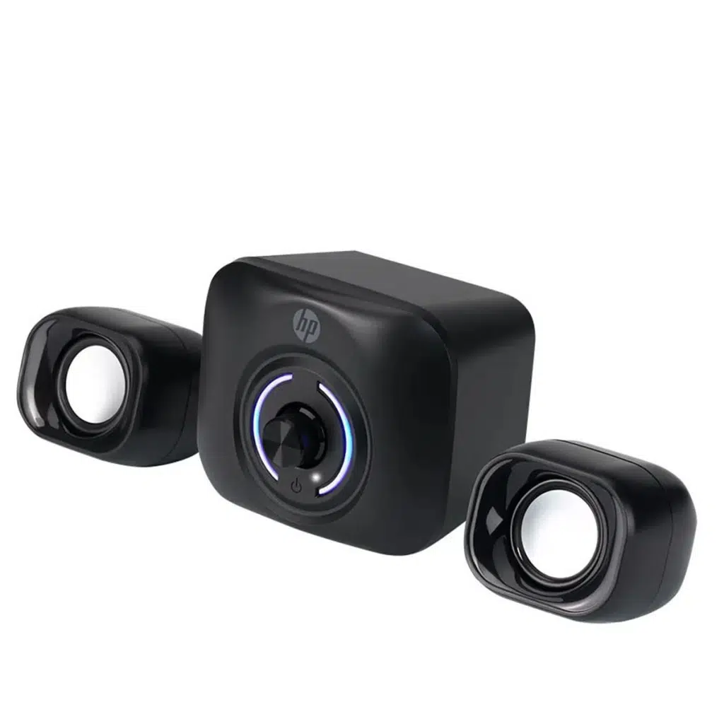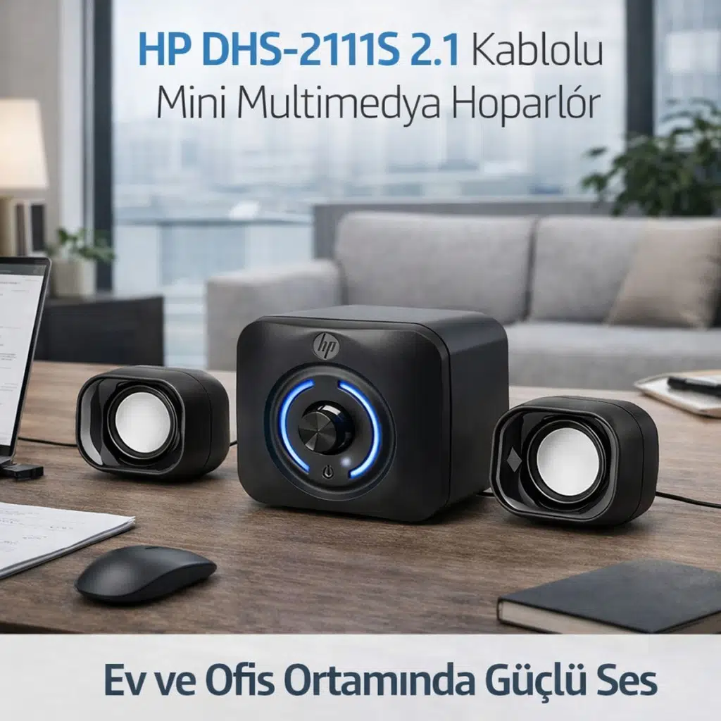 HP DHS-2111S 2.1 Kablolu Mini Multimedya Hoparlör, masaüstü bilgisayarlar, dizüstü bilgisayarlar, televizyon ve diğer ses çıkışı olan cihazlarla kullanabileceğiniz kompakt ve basit bir hoparlör sistemidir. 3.5 mm ses jakı (aux) ile ses cihazınıza bağlanırken USB kablo üzerinden güç alır.