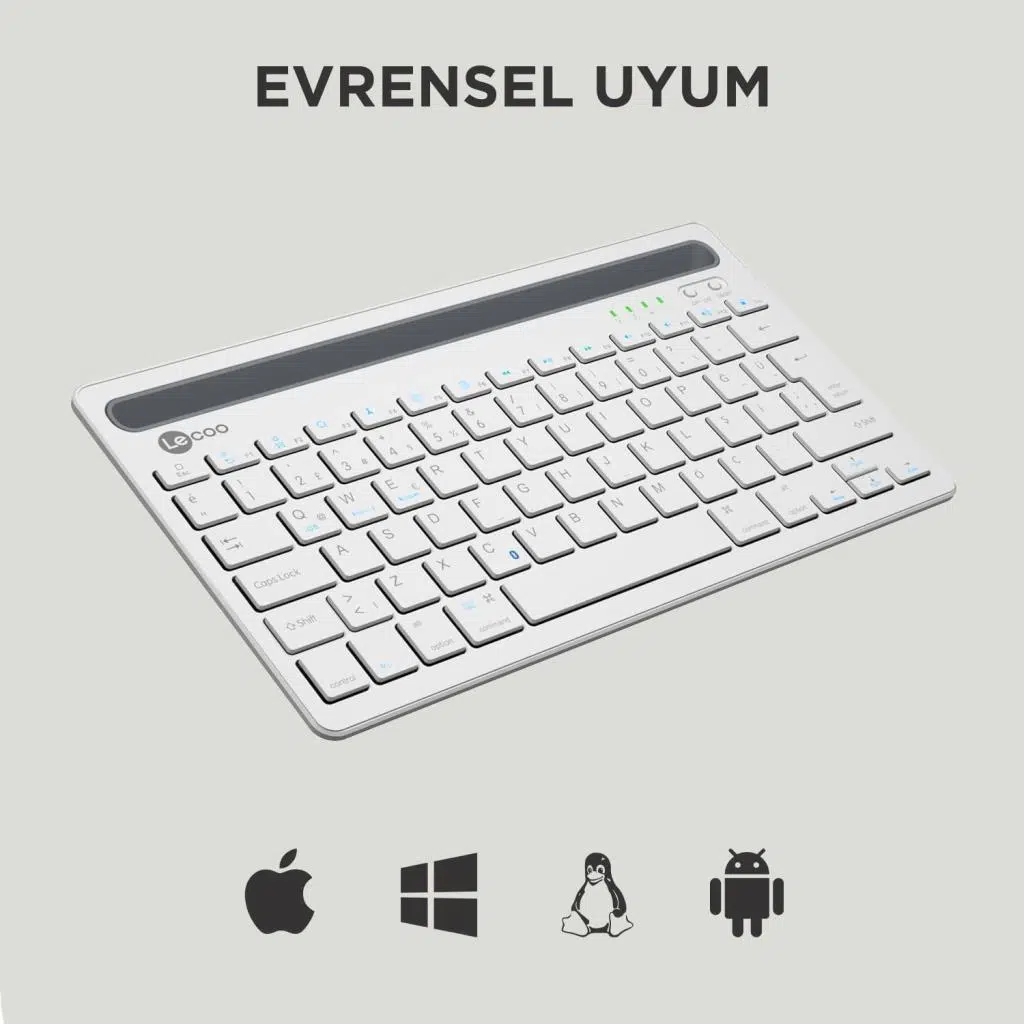Lecoo BK100 Çoklu Cihaz Özellikli Şarj Edilebilir Kablosuz Bluetooth Klavye, Android 3.0 ve üstü, iOS 4.0 ve üstü, Windows XP/7/8 ve üstü sistemleri desteklemektedir. Mac, iPad, iPhone, laptop, PC, tablet, akıllı telefonlarda kullanabilirsiniz.