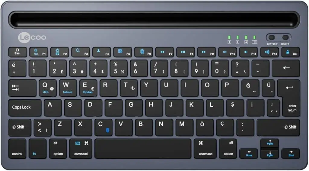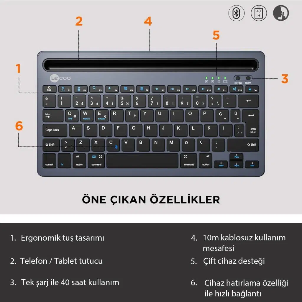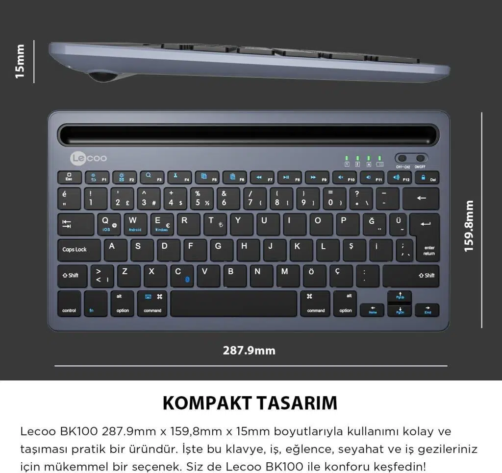Lecoo BK100 Çoklu Cihaz Özellikli Şarj Edilebilir Kablosuz Bluetooth Klavye, aynı anda iki cihazı destekleyen ve aynı anda 2 cihazı hızlı bir şekilde değiştirerek kullanabileceğiniz mini bir Bluetooth klavyedir. İş, eğlence, seyahat ve iş gezisi için uygundur.