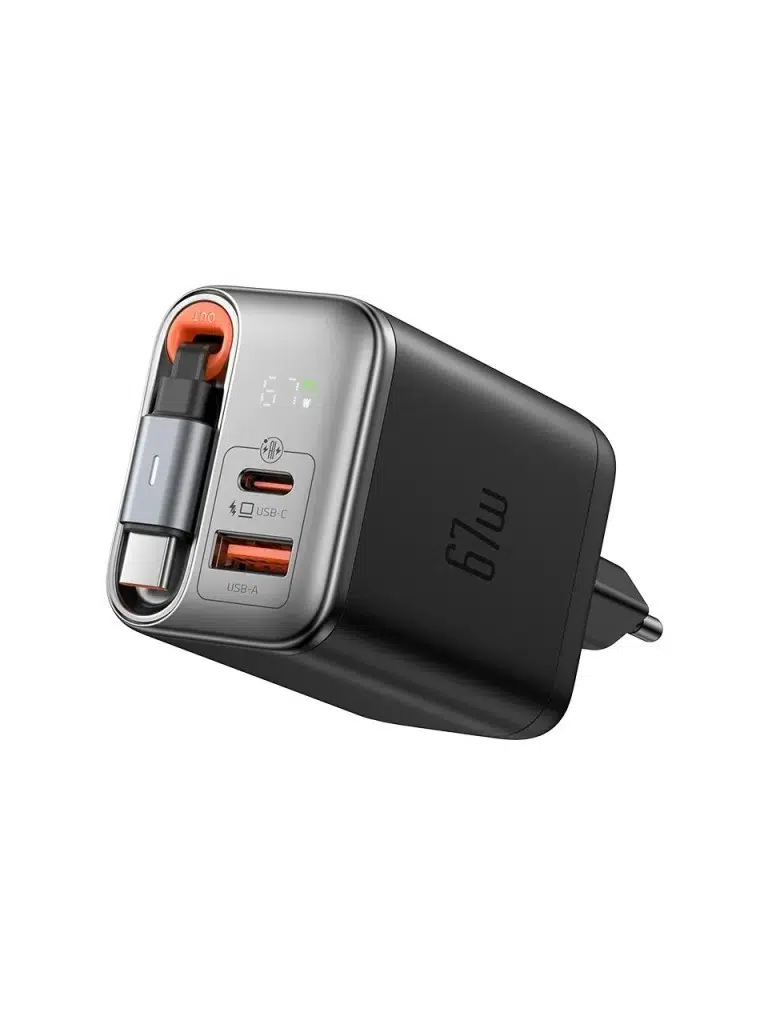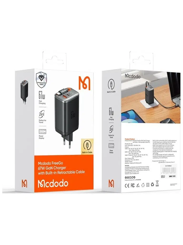 Mcdodo FreeGo 67W GaN Şarj Cihazı CH-4100 Dahili Geri Çekilebilir USB-C Kablo + LED Güç Göstergesi | 3 Cihazla Aynı Anda Şarj | Kompakt, Taşınabilir Tasarım 3’ü 1 Arada Şarj Avantajı Dahili USB-C kablo (60W'a kadar destekler)1 x USB-C port (67W’a kadar)1 x USB-A port (30W’a kadar) Toplamda 3 cihazı aynı anda hızlı şarj etme imkânı!LED Güç Göstergesi Gerçek zamanlı şarj gücünü gösteren akıllı LED ekran, kullanım sırasında şarj durumunu anlık olarak takip etmenizi sağlar. Gelişmiş GaN Teknolojisi ile Kompakt Güç Daha küçük boyutDaha düşük ısı üretimiDaha verimli enerji kullanımı Gallium Nitride (GaN) teknolojisi, FreeGo’yu yüksek performanslı ve taşınabilir bir şarj çözümüne dönüştürüyor.Güvenli ve Sertifikalı CE / FCC / RoHS SertifikalıAşırı ısınma, aşırı akım ve kısa devreye karşı akıllı korumaYangına dayanıklı PC malzeme (V0 derecesi) Kutu İçeriği Mcdodo FreeGo 67W GaN Şarj Cihazı x1Kullanım Kılavuzu x1Garanti Belgesi x1
