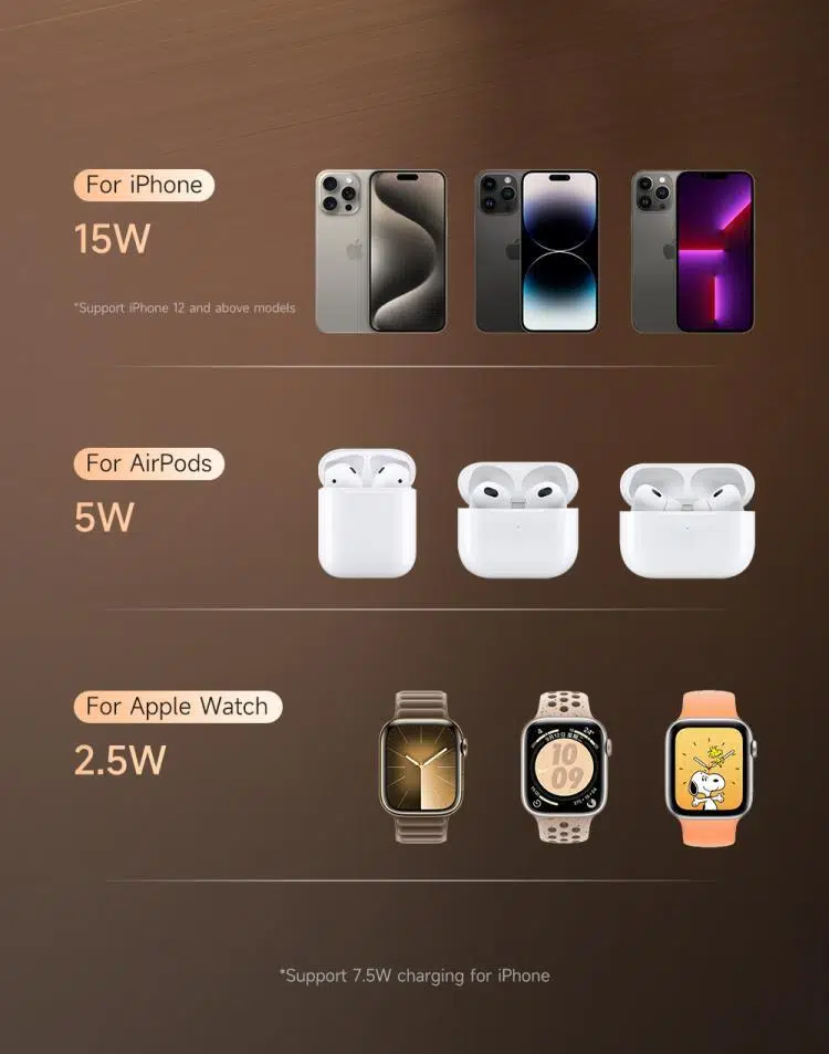 - Üçlü Fonksiyon: Telefon, Apple Watch ve AirPods için ayrı ayrı şarj alanlarına sahiptir.
